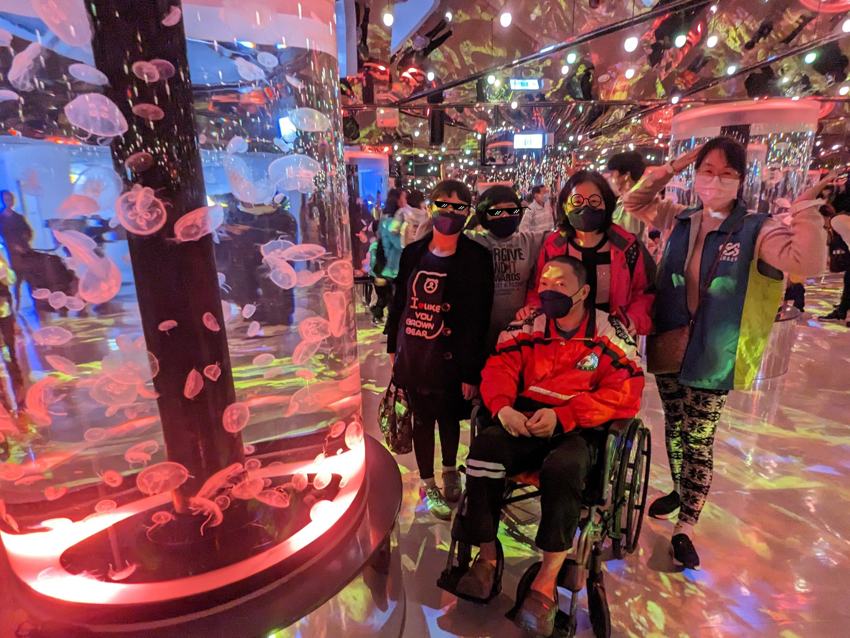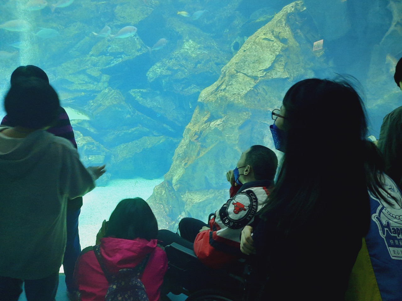 黃爸爸帶著孩子們及母親前往桃園Xpark,觀賞館中巨大的水族展間。